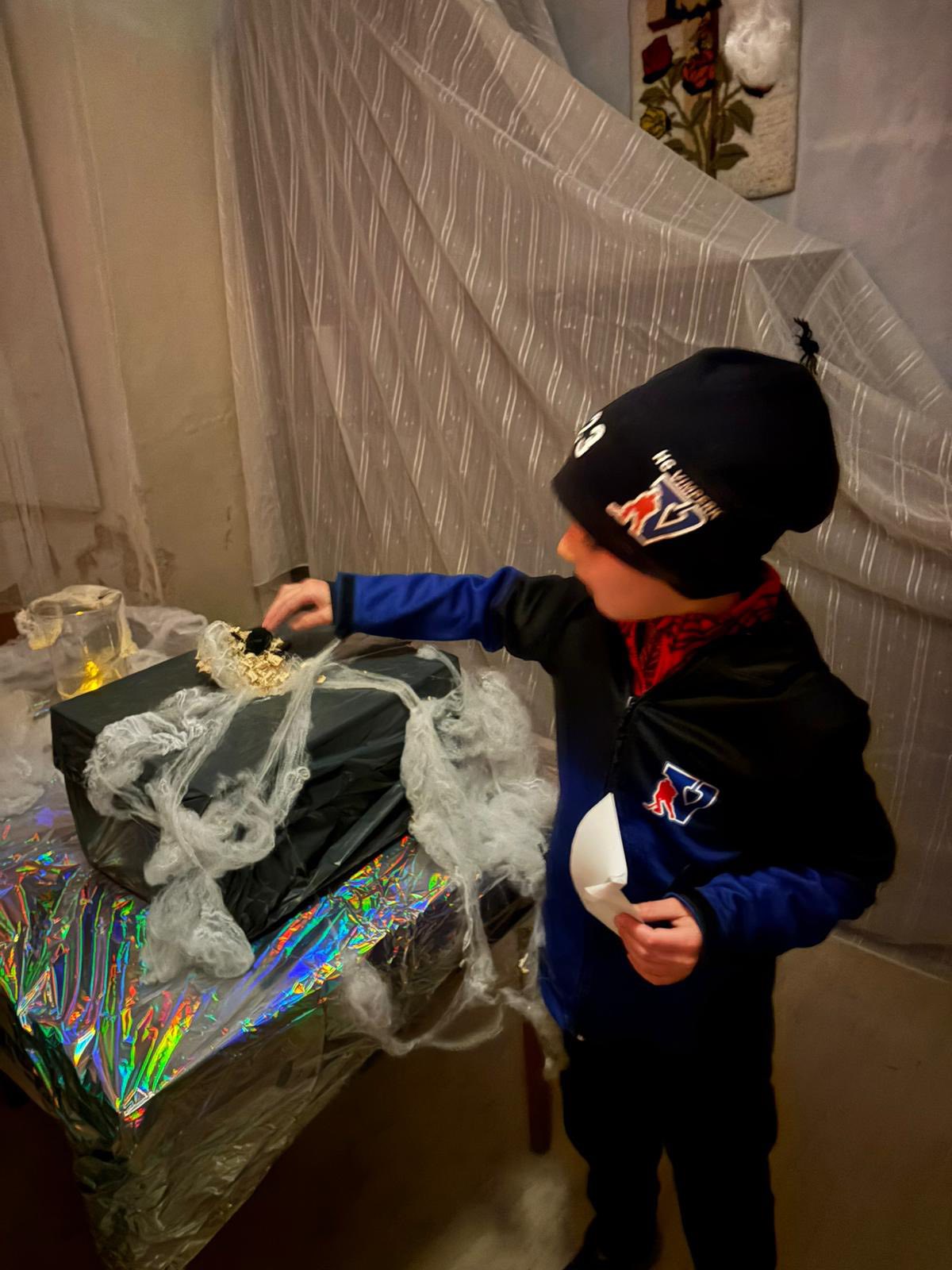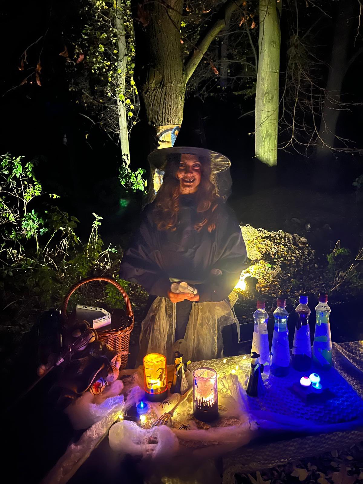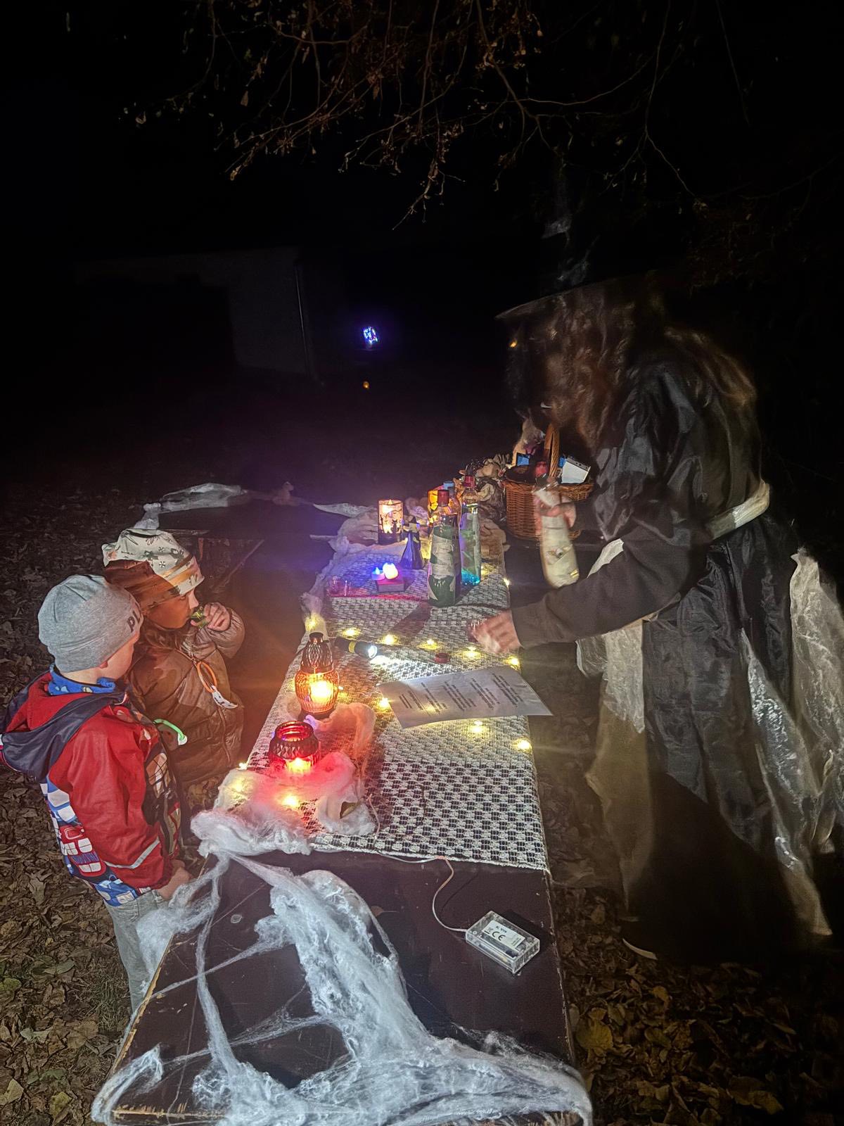 Děti si nejdřív pochutnaly na pizze, vyrobily si náramek odvahy a pak se po setmění vydaly na strašidelnou stezku na potemnělou faru a kolem hřbitova. Cestou potkaly duchy, děsivého králíka, upíra a u čarodějnice v lese si dokonce uvařily kouzelný lektvar! 🍵✨